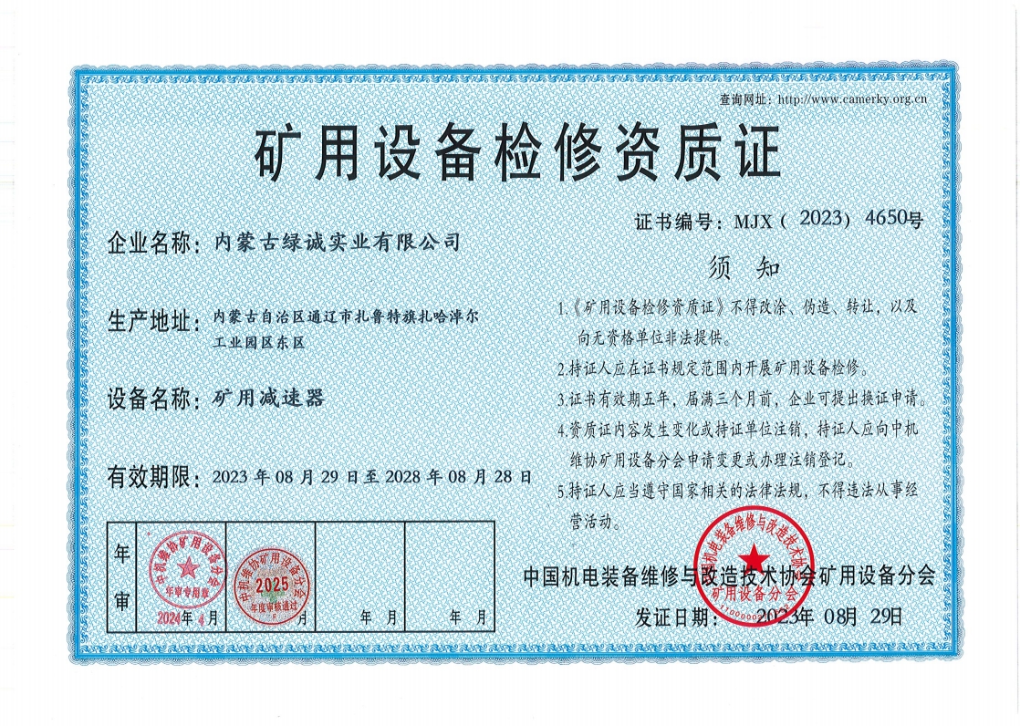 2018年我公司通過中國機電裝備維修與改造技術協會礦用設備分會審核并取得了9項礦用設備檢修資質證書。公司本著“誠信為本 質量為先 全心全意為客戶 ”的服務理念,圓滿完成各個廠礦的機械維修及配套服務,期待與您共同合作。
